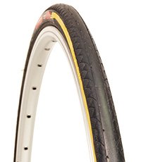 fast narrow tire offers double to triple the mileage of racing rubber, extra thick 5mm long lasting carbon rubber tread, round profile for predictable handling, black wall with colored stripes, made in Japan by Panaracer, 110psi max., wire bead. Read more...